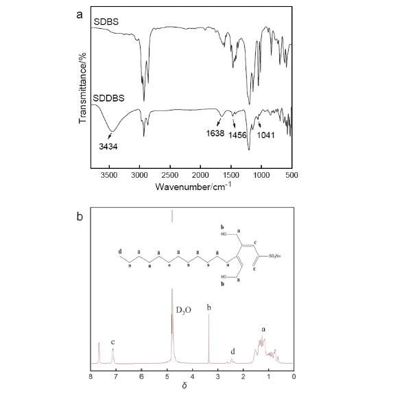 界面潤濕性調(diào)控驅(qū)油劑SDDBS的合成示意圖如圖1所示.通過紅外光譜和核磁共振氫譜對合成原料十二烷基苯磺酸鈉(SDBS)和最終產(chǎn)物二羥甲基十二烷基苯磺酸鈉(SDDBS)進行結(jié)構(gòu)表征.由圖2a可見,位于1456和1638 cm-1的特征峰證明了苯環(huán)的存在,3434 cm-1處寬峰為O―H的伸縮振動峰,通過對比SDBS和SDDBS的紅外光譜,可以判斷SDDBS中含有羥基基團.由圖2b可得,δ4.8為D2O溶劑峰;δ0.6~1.49為亞甲基上的質(zhì)子峰(a);δ2.32~2.60的三重峰為甲基上的質(zhì)子峰(d);δ3.35為羥基上的質(zhì)子峰(b);δ7.14為芳烴特征峰(c).通過1H NMR確定了最終產(chǎn)物中羥基等基團的存在及位置.紅外光譜和核磁共振氫譜結(jié)果表明目標(biāo)產(chǎn)物SDDBS合成成功,結(jié)構(gòu)準確.