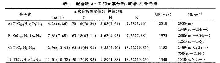 試劑及溶劑均為分析純;使用1106型元素分析儀(意大利)測定碳、氫、氮含量;FT-S135型紅外光譜儀(KBr壓片)測其產(chǎn)物;EDTA絡(luò)合滴定法測定稀土元素含量;LDT-1700質(zhì)譜儀測得激光解析、電離飛行時間;SPEX-FL2T2熒光光譜儀測熒光強度;Backman DU-1700紫外-可見光譜儀;在芬蘭KSV-5000雙層拉膜機上進行π-A曲線的測定和膜材料的制備。