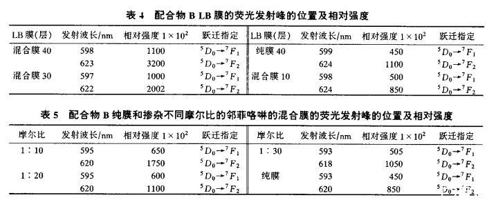 配合物B和鄰菲咯啉摩爾比為1:10時,制成40、30、10層混合LB膜,與40層純膜進行比較。結(jié)果表明(表4):同層數(shù)的混合膜與純膜相比,混合膜的熒光性遠高于純膜。實際上,30層的混合膜熒光強度就比純膜40層的強。說明鄰菲咯啉吸收能量后再傳遞給稀土離子,起著分子間傳遞能量的作用。使混合膜的熒光強度增加。當(dāng)配合物與鄰菲咯啉的摩爾比變?yōu)?:20和1:30(20層)時,熒光強度反而下降(表5)。