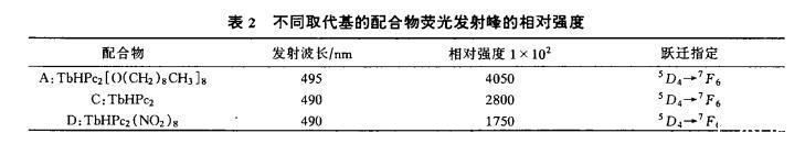 表2列出了配合物A、C、D在氯仿溶液中,指定熒光激發(fā)(375nm)和熒光發(fā)射峰波長、相對強度及躍遷指定。配合物A、C、D是由不同取代基構(gòu)成的雙酞酞菁鋱(III)配合物,當(dāng)取代基為給電子的壬氧基時(A),可使基態(tài)與最低激發(fā)態(tài)之間的躍遷幾率增大,有較強的熒光行為,使熒光強度增加;而取代基為吸電子的硝基時(D),它使熒光強度下降,故有較弱的熒光行為;而酞酞菁是環(huán)上無取代基的絡(luò)合物C,故它的熒光強度居中。