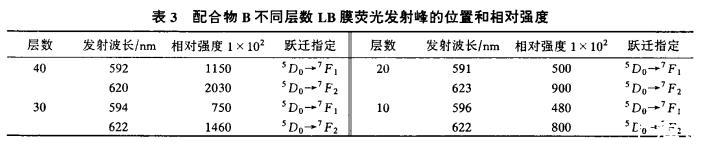 表3配合物B不同層數(shù)LB膜熒光發(fā)射峰的位置和相對強度