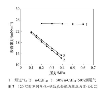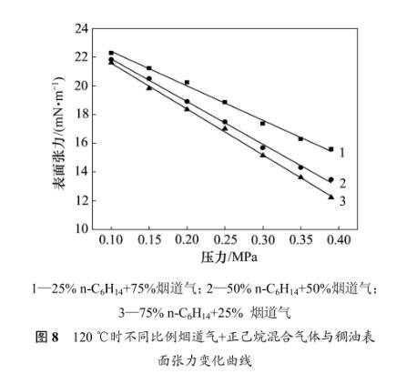 圖7對比了120℃時煙道氣、正己烷和煙道氣+正己烷3種氣體與稠油的表面張力變化規律。由圖7可見:當溫度一定時,3種氣體-稠油表面張力均隨壓力的增大而減小,但是變化的幅度不同;在低壓下,煙道氣對降低稠油表面張力作用有限,當氣體中含有正己烷時,稠油的表面張力明顯降低;在120℃和0.3 MPa時,煙道氣-稠油表面張力為24.70mN/m,向煙道氣中加入50%(摩爾分數)的正己烷后表面張力為15.89mN/m,與純正己烷氣體表面張力相差不大,后者為 15.19 mN/m。前面的研究表明,煙道氣-稠油表面張力可以由 CO2-稠油表面張力和 N2-稠油表面張力線性疊加得到,但是對于煙道氣+正己烷混合氣體,正己烷對降低表面張力起主要作用,不能簡單的由煙道氣-稠油表面張力和正己烷-稠油表面張力進行簡單的線性插值進行計算。
