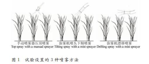 在水稻分蘗蘗期、孕穗期和揚(yáng)花期分別采用如圖1所示的3種噴霧方法進(jìn)行試驗(yàn),其中彌霧機(jī)噴頭下傾噴霧方法霧流方向角約為45^{circ}(垂直向下為0^{circ})。每種噴霧方法分別噴灑用清水和100mg/L TX-10溶液配制的2000mg/L麗春紅-G溶液。