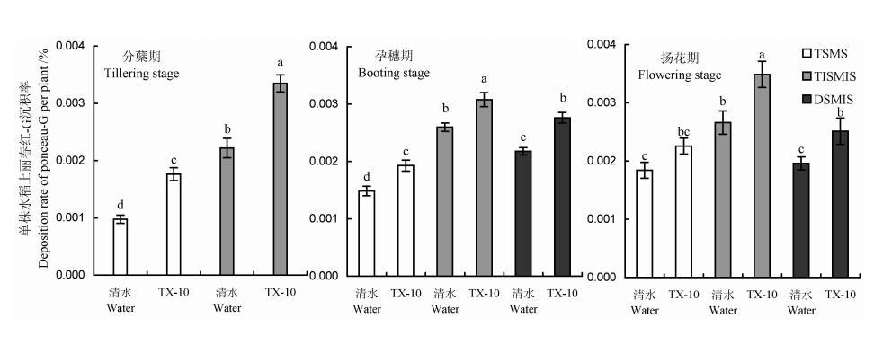 清水的表面張力為71.80mN/m,用清水配制的麗春紅-G溶液的表面張力高于水稻葉片臨界表面張力。用100mg/LTX-10溶液配制的麗春紅-G溶液表面張力低于水稻葉片臨界表面張力。從圖4可以看出,與噴灑清水配制的麗春紅-G溶液相比,在水稻3個(gè)生育期,采用相同噴霧方法噴灑TX-10溶液配制的麗春紅-G溶液,都增加了水稻植株上麗春紅-G的沉積率。以在水稻生長(zhǎng)量較小的分蘗蘗期增加幅度最大,其中手動(dòng)噴霧器壓頂噴霧增加了80.85%,彌霧機(jī)下傾噴霧增加了50.83%,差異達(dá)顯著水平(F=57.17>F0.01=26.18,df=3,116,P<0.01)。