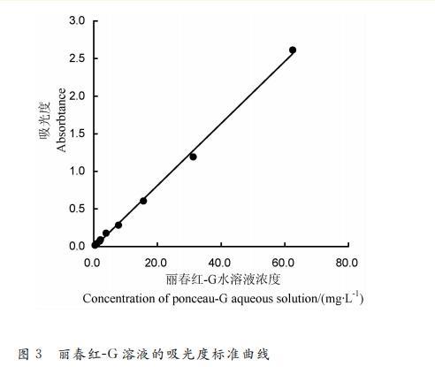 圖3是以麗春紅-G溶液的質(zhì)量濃度為橫坐標(biāo),以不同濃度麗春紅-G溶液在510nm處吸光度為縱坐標(biāo)的標(biāo)準(zhǔn)曲線,其方程為y=0.0413x-0.0142(R2=0.9980)。