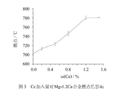 1)在一定范圍內,隨著Ce含量的增加,合金的燃點也隨之提高,當Ce含量達到1.2%時,合金的燃點能達到780℃。