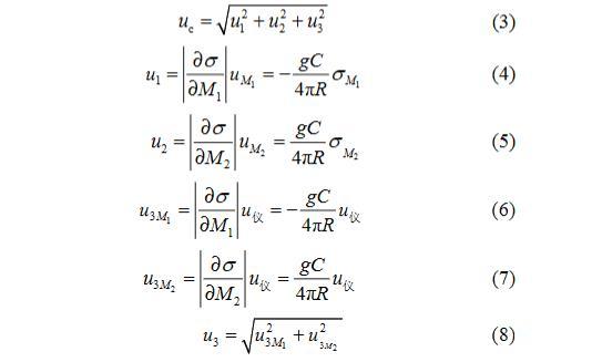 參照文獻(xiàn),分析測(cè)量方法可知,在某一測(cè)量溫度工況點(diǎn),對(duì)表面張力σ測(cè)量不確定度影響顯著的因素有:M1和M2的重復(fù)性測(cè)量引起的不確定度u1、u2;電子天平示值誤差引起的不確定度u3。