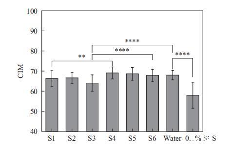 這里我們使用這種方法評估了6種表面活性劑復(fù)合物的溫和性。如圖5所示,SMCT體系(S4-S6)的CIM值與水的CIM值相當(dāng),并且顯著高于SLES體系(S1-S3)。這表明SMCT體系表現(xiàn)出優(yōu)異的溫和性,對皮膚脂質(zhì)屏障的破壞潛力低于SLES體系。對于SLES體系,引入非離子表面活性劑導(dǎo)致S2(含APG)的CIM略有變化,但S3(含海藻糖脂)的CIM顯著降低。類似地,對于SMCT體系,加入APG(S5)和海藻糖脂(S6)后,CIM值顯著低于S4。這表明加入海藻糖脂對兩種體系的溫和性都有影響,意味著皮膚脂質(zhì)提取能力增強(qiáng)。然而,這一結(jié)果與上述體外細(xì)胞測試中IL-1a測試的結(jié)果相矛盾。這種差異可能是由于兩種方法的作用機(jī)制不同。角質(zhì)層表面測量法主要反映表面活性劑對皮膚脂質(zhì)屏障的破壞,而細(xì)胞測試中的IL-1a與細(xì)胞反應(yīng)相關(guān)。但細(xì)胞不像皮膚那樣擁有脂質(zhì)屏障。