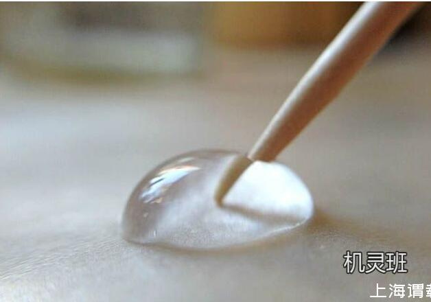 3、再用蘸有洗潔精的牙簽戳水滴。注意觀察出現的現象:水滴會散開。