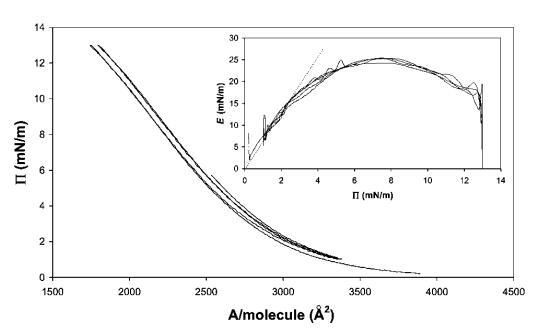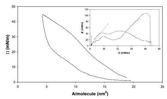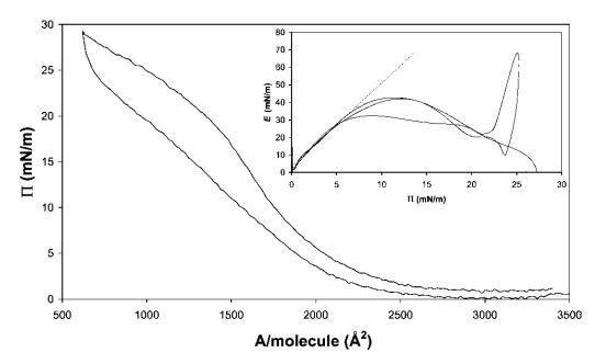 圖7在20℃下測量的15 mg b-乳球蛋白在中性pH水上的P–A和(插圖)E–P曲線。 插圖中繪制的虛線表示E–P曲線的初始坡度。