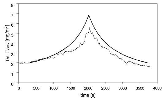 橢偏儀數據中,我們可以使用de Feijter的方法在壓縮過程中的每個點獲得蛋白質吸附凝膠(t)量的估計,因為該過程足夠慢,允許我們進行橢偏儀測量。如果蛋白質在整個壓縮過程中仍不可逆地吸附在界面上,則凝膠(t)應根據Gcomp(t)=M0/A(t))遵循表面積的變化,其中M0是界面處蛋白質的初始量,A(t)是槽屏障之間的面積。