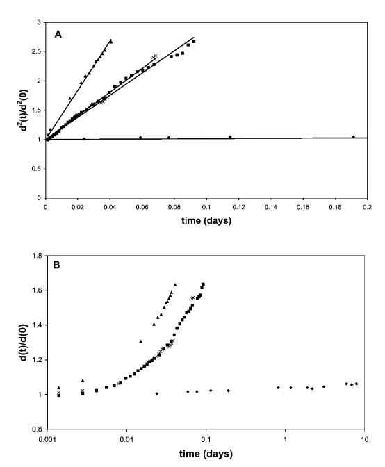 圖1面板A顯示了黃原膠溶液中50 vol%氣泡的相對平方氣泡直徑d2(t)/d2(0)。 泡沫由含有0.1 wt%HFBII(A)、0.5 wt%b-lg(-)、0.1 wt%b-酪蛋白(:)和0.1 wt%Quillaja皂甙(*)的水溶液生成。 將所得泡沫轉移到0.5 wt%黃原膠溶液中。 面板B以對數時間刻度顯示整個時間間隔內的數據。
