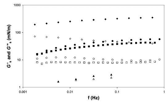 圖11 HFBII(a)、b-乳球蛋白(-)、b-酪蛋白(:)和奎拉葉皂苷(C)的表面剪切儲存(填充符號)和損失模量(開放符號)作為振蕩頻率的函數。