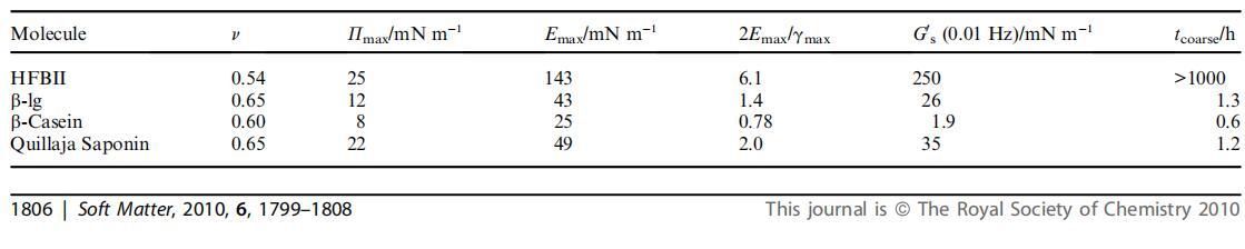 當我們現在再次考慮表1中的2Emax/gmax比率時,很明顯HFBII超過了5的值,這表明這將穩定泡沫,防止收縮。 根據Kloek等人的說法,對于b-乳球蛋白和皂甙,我們報告的值介于1和2之間,表明氣泡收縮延遲,但沒有完全停止。2食品蛋白質通常屬于這種狀態,對歧化過程的抵抗力相對較小。10最后, 根據這個比率,b-酪蛋白根本無法抵消氣泡收縮,因為2Emax/gmax<1,這是主要的吉布斯標準。
