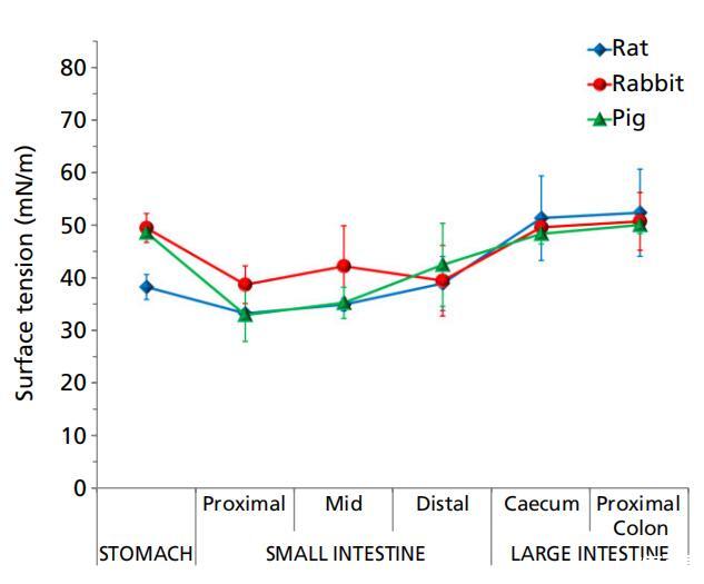 大鼠胃內(nèi)容物的表面張力與小腸的表面張力無(wú)統(tǒng)計(jì)學(xué)差異,但顯著低于盲腸和結(jié)腸(P<0.05)。 兔胃腸內(nèi)容物的表面張力曲線具有特征性。 胃液的表面張力較高,近端小腸的表面張力較低(P<0.05),盲腸的表面張力顯著升高(P<0.05),結(jié)腸的表面張力保持不變。 豬胃液的表面張力比兔子高; 兔胃腸內(nèi)容物的表面張力曲線具有特征性。胃液的表面張力較高,近端小腸的表面張力較低(P<0.05),盲腸的表面張力顯著升高(P<0.05),結(jié)腸的表面張力保持不變。豬胃液的表面張力比兔子高;然后在小腸中減少(P<0.05),在盲腸和近端結(jié)腸中增加以匹配胃水平,在遠(yuǎn)端結(jié)腸中進(jìn)一步增加(P<0.05)。