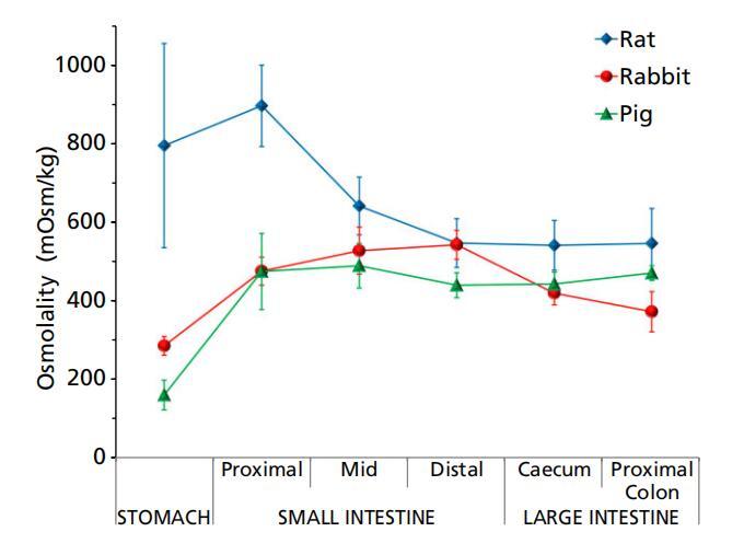 三種動(dòng)物模型的胃腸內(nèi)容物的滲透壓通常遵循相同的趨勢(shì),胃低,近端小腸增加,遠(yuǎn)端減少。豬似乎沿著這種模式一直到盲腸,在結(jié)腸處進(jìn)一步輕微增加(圖2)。然而,在大鼠中,由于胃滲透壓的高度可變性,胃內(nèi)容物的滲透壓與近端和中端小腸的滲透壓沒(méi)有統(tǒng)計(jì)學(xué)差異。這種滲透壓模式通常與消化系統(tǒng)的生理學(xué)相一致,在消化系統(tǒng)中,大多數(shù)食物在小腸中被消化并分解為葡萄糖、氨基酸和脂肪酸等組成成分,因此液體的滲透壓較高。隨著營(yíng)養(yǎng)被腸道進(jìn)一步吸收,內(nèi)容物的滲透壓降低。