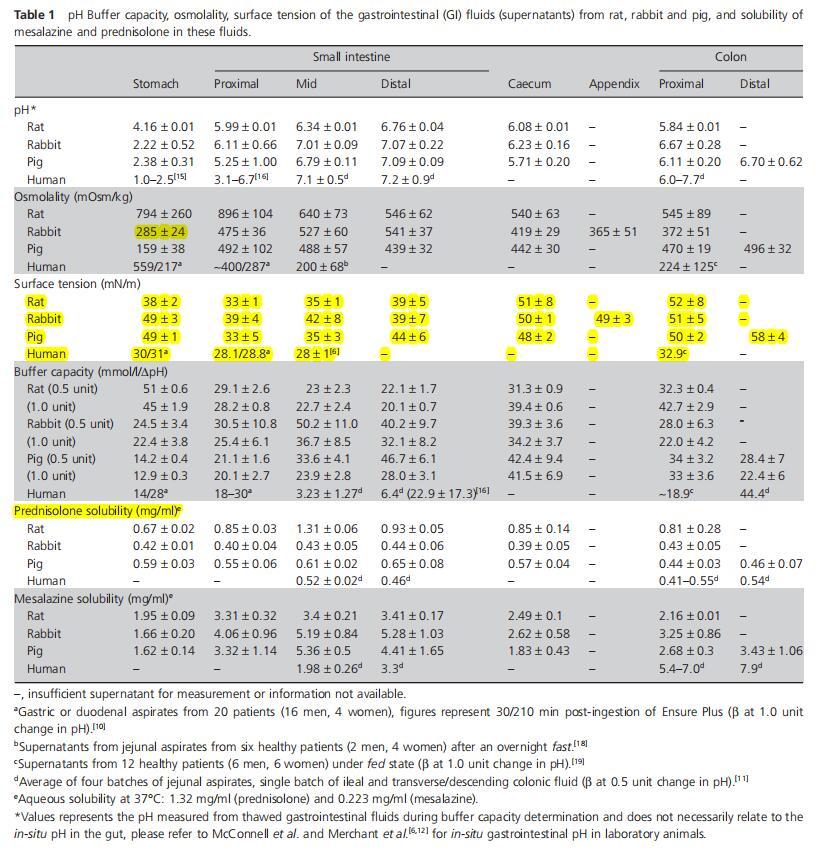 表1大鼠、兔和豬胃腸液(上清液)的pH緩沖容量、滲透壓、表面張力以及美沙拉秦和潑尼松龍?jiān)谶@些液體中的溶解度。