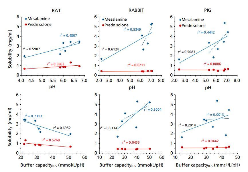 需要注意的是,F(xiàn)adda等人[11]報(bào)告了使用體液的相關(guān)性 未考慮胃液中的溶解度,這在此處介紹的動(dòng)物液中的相關(guān)性中得到了解釋。有趣的是,在排除動(dòng)物液中的胃溶解度后,人和動(dòng)物液中的相關(guān)性變得相似(圖5中的虛線) 此外,盡管區(qū)域pH值和緩沖容量較高,但豬遠(yuǎn)端小腸的平均溶解度并不高于中小腸(表1),這可以通過(guò)該區(qū)域較高的表面張力(44±6 vs.35±3)來(lái)解釋 表面張力與美沙拉秦在兔子體內(nèi)的溶解度之間存在一定的親和力(標(biāo)準(zhǔn)化系數(shù)β)= ? 0.802,P=0.055;r2=0.643)。需要注意的是,用于產(chǎn)生這些相關(guān)性的pH值對(duì)應(yīng)于液體上清液中的測(cè)量值,這不一定與腸道中的原位pH值相關(guān)。