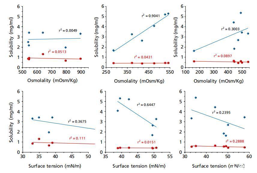 圖5:美沙拉秦(藍(lán)色鉆石)和潑尼松龍(紅色圓圈)在大鼠、兔和豬胃腸液(上清液)中的溶解度與其pH值、緩沖容量、滲透壓和表面張力的函數(shù)關(guān)系,其中藍(lán)色虛線表示除胃液外的美沙拉秦相關(guān)性。