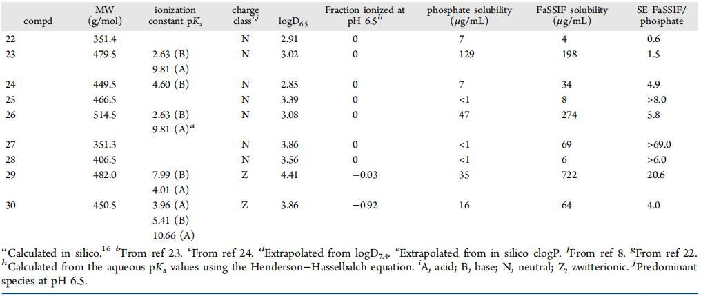 以前曾使用一組參考化合物觀察到,電離酸性化合物的硒通常低于電離堿。結(jié)果表明,由于與帶負(fù)電荷的FaSSIF介質(zhì)組分之間的靜電排斥作用,離子酸在FaSSIF中的溶解度沒有增加。8在目前的研究中,對于幾個涵蓋更廣泛化學(xué)空間的專利化合物,我們沒有發(fā)現(xiàn)離子化酸或堿之間硒的任何顯著溶解度差異,這表明靜電相互作用可能被其他因素掩蓋或覆蓋,如化合物的構(gòu)象和親油性。