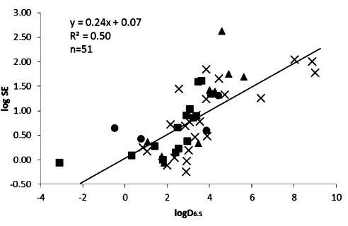圖2。在pH值為6.5時,51種化合物的溶解度增強(qiáng)(SE=S_-FaSSIF/S_-水溶液)是辛醇/水分配系數(shù)的函數(shù)?;衔锉粴w類為酸(■),基地(▲),中性(×)和兩性離子(●).高于或低于檢測限的值在檢測限處繪制。