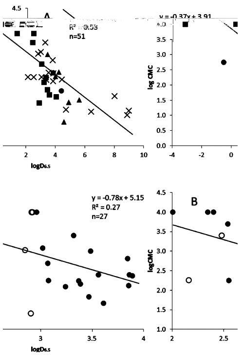 圖6。對于分類為酸的完整化合物組(A),根據(jù)pH 6.5(logD6.5)下的辛醇分配系數(shù)繪制對數(shù)CMC(μM)(■),基地(▲),中性離子(x)和兩性離子(?),以及l(fā)ogd2和logd4(B)范圍內(nèi)的化合物。圖B中的開放圓對應(yīng)于從文獻(xiàn)檢索、預(yù)測或從pH值為7.4的logD推斷的logD值。高于或低于檢測限的值在檢測限處繪制。