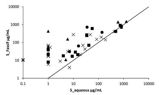 圖1。測定了51種化合物在磷酸鹽和FaSSIF緩沖液中pH值為6.5時的平衡溶解度?;衔锉粴w類為酸(■),基地(▲),中性(×)和兩性離子(●).線對應(yīng)于單位線。低于檢測限的值在檢測限處繪制。