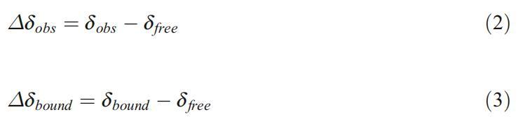在任何給定的α-環(huán)糊精濃度下,結(jié)合表面活性劑分子的分?jǐn)?shù)都可以通過其信號(hào)的化學(xué)位移來確定。客體分子在束縛態(tài)(δ束縛態(tài))和自由態(tài)(δ自由態(tài))有不同的化學(xué)位移。在自由形式和束縛形式之間的平衡以及這兩種狀態(tài)之間的交換率(比共振頻率差快)的情況下,將僅觀察到一個(gè)具有觀測(cè)到的化學(xué)位移(δobs)的信號(hào),即δ束縛和δ自由之間的加權(quán)平均數(shù)。對(duì)于以下內(nèi)容,我們定義了觀察到的化學(xué)位移變化(?δobs)和結(jié)合時(shí)化學(xué)位移的變化(?δ界):