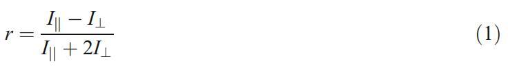 使用熒光偏振儀系統(tǒng)(Beacon 2000)在25.0±0.2°C下進(jìn)行所有熒光各向異性測(cè)量。RB用作熒光探針,其濃度保持在0.1μM。分別使用570和630 nm的激發(fā)和發(fā)射波長(zhǎng)測(cè)量熒光各向異性。當(dāng)發(fā)射偏振器平行或垂直于偏振激發(fā)方向時(shí),每個(gè)熒光強(qiáng)度稱為I||或I┴,分別地各向異性是強(qiáng)度差(I||-I)的比率┴)總強(qiáng)度(I||+2I)┴)如等式1[24,25]所示: