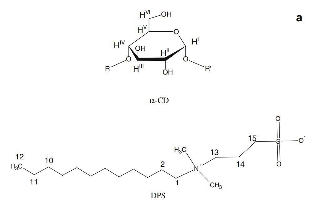 圖7a顯示了α-CD、DPS和Mega-10的示意圖,以簡化表面活性劑原子與CD原子的相互作用。2DROESY數據證明表面活性劑的烷基鏈包含在α-環糊精的疏水腔中。光譜如圖7b和c所示??梢钥吹奖砻婊钚詣┕舱衽c位于環糊精空腔內的HIII、HV和HVI共振的交叉峰。未觀察到分子(HI、HII和HIV)外部與環糊精原子的相互作用。對于這兩種表面活性劑,與HIII和HV的相互作用似乎覆蓋了從末端甲基到H3的整個烷基鏈。這意味著幾個不同的復雜幾何形狀和穿透深度之間的快速交換。在鎘原子和親水性頭基之間沒有觀察到相互作用。