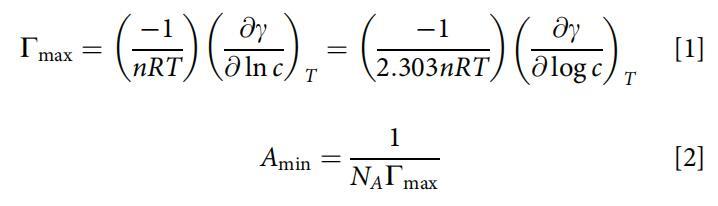 根據吉布斯吸附等溫線方程(方程1和2)[23]的近似形式計算最大表面過剩(Cmax)和最小表面積(Amin):