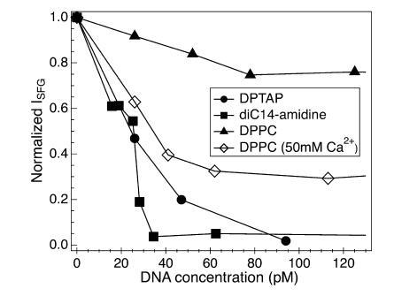 我們發現,光譜響應中最顯著的差異與靜電學的變化有關:陽離子脂質下界面D2O的OD拉伸的振幅和線型比兩性離子脂質DPPC下的OD振幅和線型對DNA濃度的增加更敏感。對于DPPC/DNA/Ca2+系統,觀察到一種介于陽離子脂質/DNA和DPPC/DNA之間的反應,這與之前的工作一致,之前的工作提出Ca2+的作用是部分中和DPPC磷酸基團,使兩性離子DPPC多少呈陽性,從而使脂質/DNA結合。16-19,21
