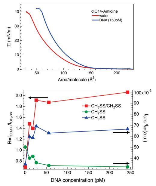 圖7。(上圖)在不存在(紅線)和存在(藍線,150μm)DNA的情況下,磷酸緩沖亞相上方的diC14氨基單層的π-面積等溫線。對于給定的脂質密度,將DNA添加到亞相會導致表面壓力增加,或者相當于脂質分子的凝聚。(下圖)不同濃度的DNA溶液上的CH2SS和CH3SS共振(三角形和圓形,右軸)的VSF強度及其比率R(正方形,左軸)。實線是眼睛的向導。
