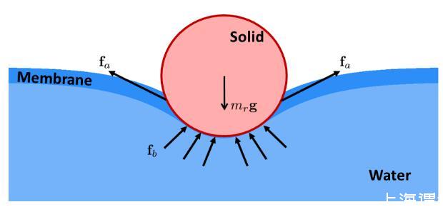 其中是流體表面的面積,稱為表面張力系數(shù)。當流體與固體發(fā)生作用時,流體表面的分子同時會受到固體分子的作用,從而將表面張力作用在固體上。固體根據(jù)表面特性不同可以分為親水和疏水兩類,疏水材質在水面上會受到向上的表面張力作用,對于一些細小的結構來說這個力要比浮力更為明顯。比如說水黽是一種可以生活在水面上的昆蟲,它的腳非常細長,并且有很多絨毛來保持疏水特性,因而水黽可以依靠表面張力維持自身的重量,并通過腳來劃動水面來向前運動甚至跳起。