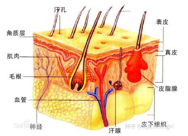 角質層:由數層角化細胞組成,含有角蛋白。它能抵抗摩擦,防止體液外滲和化學物質內侵。角蛋白吸水力較強,一般含水量不低于10%,以維持皮膚的柔潤,如低于此值,皮膚則干燥,出現鱗屑或皸裂。由于部位不同,其厚度差異甚大,如眼瞼、包皮、額部、腹部、肘窩等部位較薄,掌、跖部位最厚。