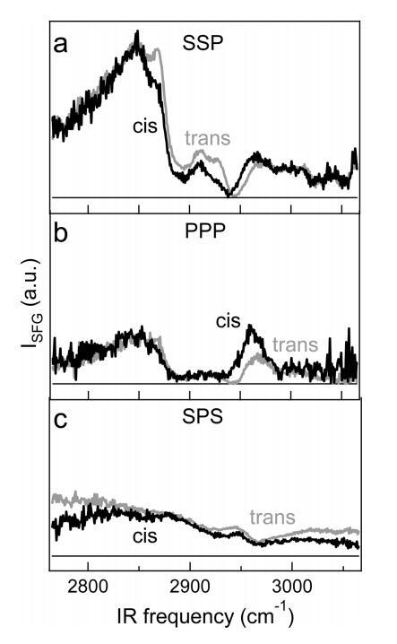 圖5:。(a)在P的反式和順式狀態下,DT-Azo-5P的純單層在65?2處的歸一化VSFG光譜與SSP極化分別為6和20 mN/m。(b)與a部分類似,但PPP極化。(c)反、順態SPS極化中的SFG譜(~每分子78?2),壓力為2和15 mN/m。三個面板具有相同的垂直刻度。
