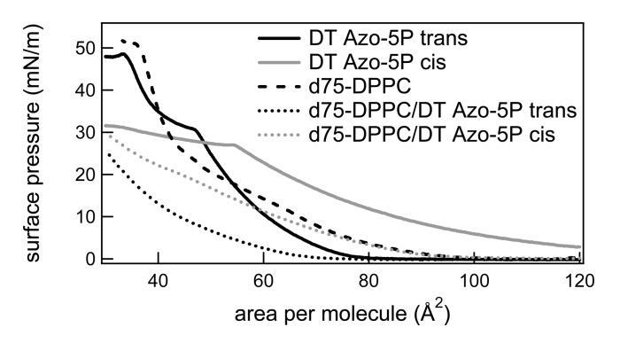 圖2:反式和順式狀態下的光開關脂質DT Azo-5P的表面壓力與面積等溫線(實線),d75-DPPC的表面壓力與面積等溫線(虛線),以及光開關兩種狀態下的1:5摩爾比的光開關脂質與d75 DPPC的表面壓力與面積等溫線(虛線)。