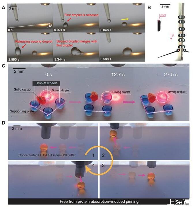 多樣化應用:光電微流控技術可將液滴定向傳輸甚至反重力爬升,在霧氣收集、3D打印、傳熱傳質等領域極具應用前景;對液滴的精確操控還造就了以液滴為驅動元件的軟體機器人,可用于信息通訊、固體傳輸、載藥釋放等關鍵領域;對高濃度蛋白質等生物流體的無損操控使得微反應裝置的重復再用成為可能,有利于減少一次性塑料的使用、減少醫療廢品、降低成本,助力醫療檢測、生化分析、微流控等領域的綠色、環保、可持續發展。利用光束精準遙控各種微液滴,應用于病理測試,可避免與感染性流體直接接觸,有利降低一線醫務人員在大流行病中測試病毒或細菌的感染風險,以及減少樣本在操控過程中污染的機會。