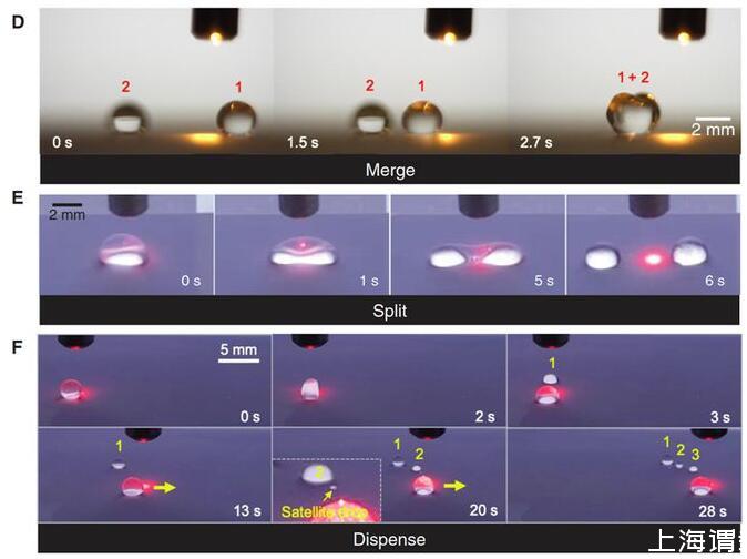 總結:在單束光的作用下,光電微流控平臺可以作為一只“魔力”的防潤濕的手來移動、切割、融合和分配任意液體,遙控且無損的精確操控液滴不僅在醫療檢測和生化分析等領域具有重要意義,而且在軟體機器人、3D打印、微流控加工制造等領域具有廣闊應用場景。