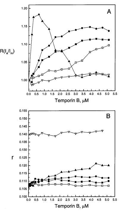圖3:通過芘標記的磷脂PPDPC(X)0.01)的熒光和DPH(X)0.002的穩(wěn)態(tài)發(fā)射各向異性r評估顳葉素B對LUV中脂質動力學的影響,顯示為具有XPOPG)0(0)、0.10(9)、0.20(B)和0.40(2)的SOPC脂質體中歸一化準分子與單體比率r(Ie/Im)(圖A)和各向異性r(圖B)的變化,Xchol)0.10(3)。每個數據點代表三次測量的平均值。標準偏差小于0.02(面板A)和0.004(面板B),為清楚起見,未顯示。否則情況如圖2圖例所示。