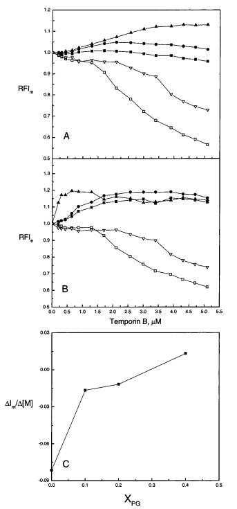 圖2:通過芘標記的磷脂PPDPC(X)0.01的熒光評估顳葉素B對LUV中脂質動力學的影響,分別顯示為芘單體和準分子發(fā)射強度Im(圖A),Ie(圖B)的變化,以及在RFIm中達到飽和反應之前Im增加的斜率(圖C)。脂質體由SOPC組成,XPOPG為0(0)、0.10(9)、0.20(b)和0.40(2),Xchol為0.10(3)。總體積為2 mL的5 mM Hepes,0.1 mM EDTA,pH 7.0,脂質濃度為20μM。使用循環(huán)水浴將溫度保持在25°C。每個數據點代表三次測量的平均值。標準偏差小于0.02(面板A和B)和0.004(面板C),為清晰起見,未顯示。