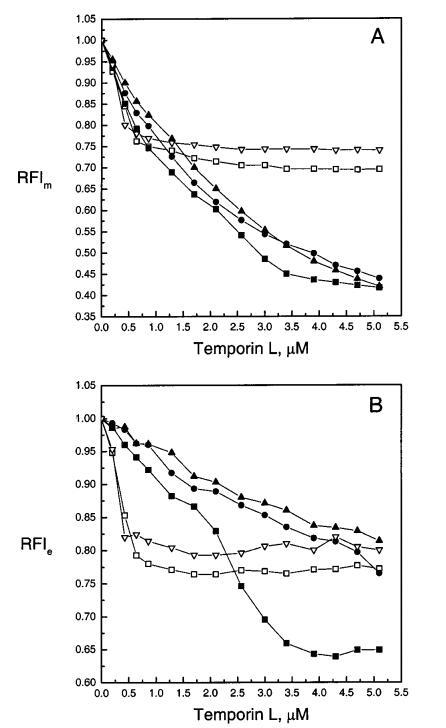 圖4:通過芘標記的磷脂PPDPC(X)0.01的熒光評估顳葉素L對LUV中脂質動力學的影響,分別顯示為芘單體和準分子發(fā)射強度Im(圖A)和Ie(圖B)的變化。脂質體由SOPC組成,XPOPG為0(0)、0.10(9)、0.20(b)和0.40(2),Xchol為0.10(3)。每個數據點代表三次測量的平均值。標準偏差小于0.02,為清晰起見,未顯示。否則情況如圖2圖例所示。