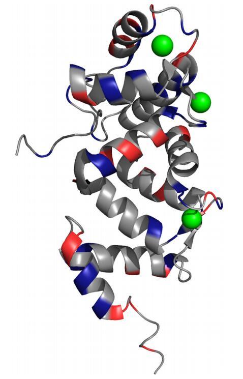 圖4.nmNCS1結構上的正(紅色)和負(藍色)電荷(PDB 2LCP)[23](關于此圖例中顏色的說明,讀者請參閱本文的web版本)。