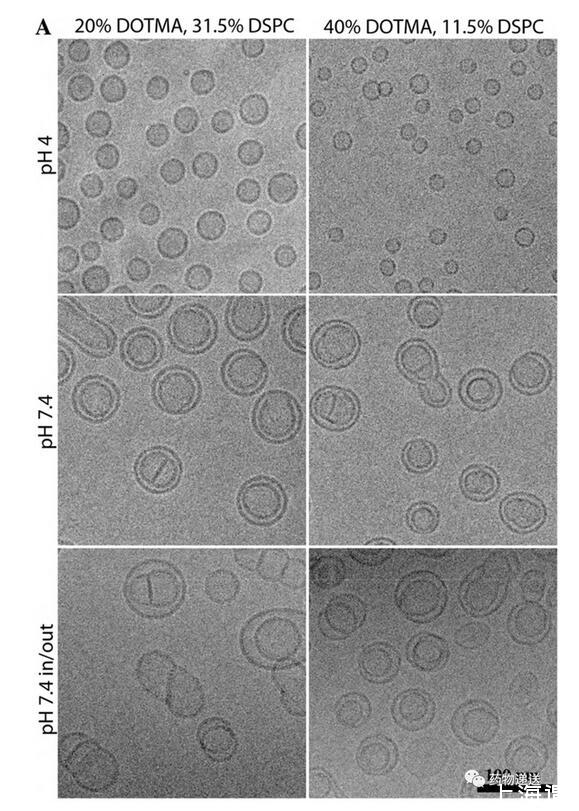 此外還發(fā)現(xiàn),采用乙醇稀釋/快速混合技術(shù)制備LNP-siRNA,當(dāng)siRNA含量較高時(shí),表現(xiàn)為堆疊的小雙層結(jié)構(gòu),其中siRNA被包載于緊密相連的脂質(zhì)雙分子層之間;當(dāng)siRNA含量較低時(shí),堆疊結(jié)構(gòu)的比例降低,LNP-siRNA復(fù)合物系統(tǒng)則表現(xiàn)出siRNA雙層結(jié)構(gòu)和非晶態(tài)電子致密核的組合,這可能是由中性形式的可電離陽(yáng)離子脂質(zhì)產(chǎn)生的油滴而形成。所得結(jié)論為:含可電離陽(yáng)離子脂質(zhì)的LNP體系在pH=4時(shí)形成雙層結(jié)構(gòu),在pH=7.4時(shí)形成非晶態(tài)“固體核”結(jié)構(gòu)。