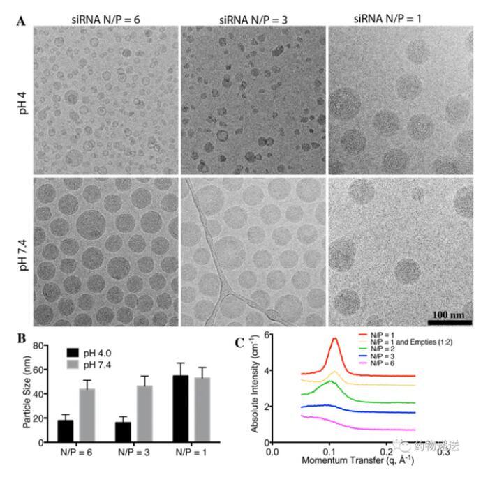 使用帶電荷脂質(zhì)制備siRNA-LNP時(shí),正電荷與負(fù)電荷的數(shù)量比會(huì)影響納米粒的大小、穩(wěn)定性、電位等性能。在siRNA-LNP中,正電荷通常為具有可電離銨根(N)的陽(yáng)離子脂質(zhì),而負(fù)電荷則為帶有大量磷酸根(P)的核酸分子,兩者可通過(guò)靜電吸附的方式結(jié)合在一起。因此,不合理的比例可能會(huì)導(dǎo)致粒徑過(guò)大、穩(wěn)定性差等缺陷。值得一提的是,在研究中發(fā)現(xiàn),當(dāng)N/P=1時(shí),pH中和后LNP的粒徑不會(huì)有較大改變;當(dāng)N/P=3或者6時(shí),LNP在pH=7.4的緩沖液中粒徑會(huì)變大。而永久陽(yáng)離子脂質(zhì)(例如DOTAP)制備的LNP在任何pH緩沖液中都不具有固體核心結(jié)構(gòu)。