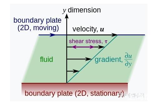 在這張圖中,下方的平板和兩個平板間的液體保持相對靜止,且液體內部沒有對自身體內不同質點的相對流動,而將上方平板做水平向右的推動??梢钥匆?,在與上方平板直接接觸的一層液面處可以達到與被推動的平板相同的速度,而在垂直距離上越遠離上層平板的部分的速度越慢,直到最下層與下方平板直接接觸的液面處速度為零,在兩個平板之間存在一個連續變化的速度分布。