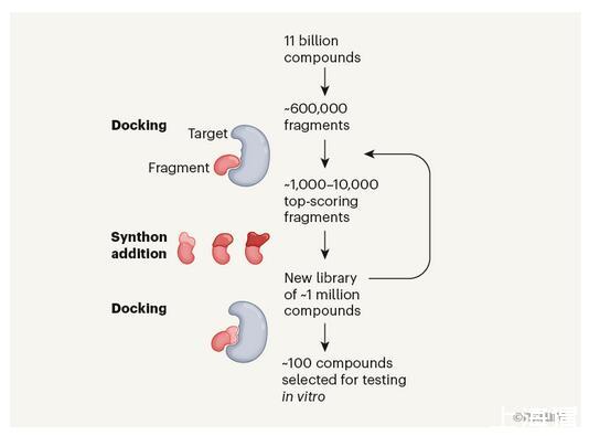 通過重復對接和添加合成子的步驟,篩選幾百萬個化合物來確定hits。隨著每一次迭代,每個化合物的大小都會隨著分子變得更加完整而增加。