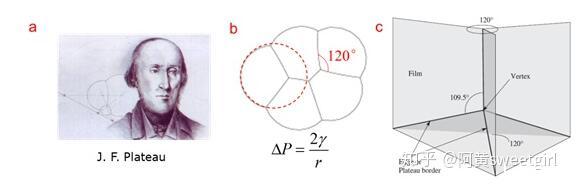 泡沫物理學(xué)集中于研究泡沫的結(jié)構(gòu)、靜力學(xué)、動態(tài)演變及排液等內(nèi)容。它是一個十分古老的學(xué)科,由比利時物理學(xué)家Plateau在19世紀(jì)中葉開創(chuàng)(圖2a)。Plateau在數(shù)十年的失明的時光里,依舊通過指導(dǎo)他侄子做試驗(yàn),堅(jiān)持研究肥皂泡薄膜的幾何形態(tài)及其背后隱藏的力學(xué)規(guī)律。1873年,他和侄子把自己的實(shí)驗(yàn)現(xiàn)象和分析結(jié)果做了系統(tǒng)整理,以法文發(fā)表,從此把對泡沫結(jié)構(gòu)的研究由定性印象推到了量化階段,開創(chuàng)了泡沫物理學(xué)(Ref 2)。在泡沫靜力學(xué)方面,Plateau的主要貢獻(xiàn)在于其提出了干泡沫的靜態(tài)結(jié)構(gòu)力學(xué)的三定律,它是后續(xù)泡沫研究的基石: