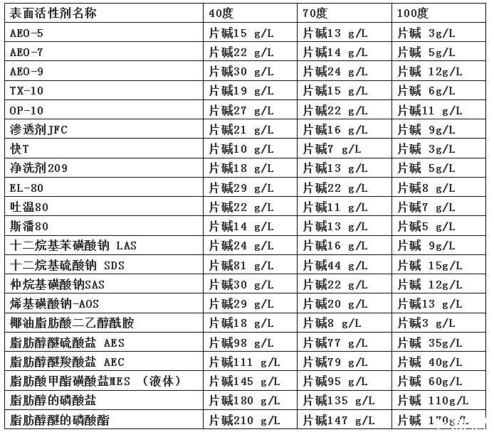 測試方法:取10g/L的表面面活性劑,加入片堿,在規定的溫度放置120分鐘后,觀察,出現分層或漂油時的堿用量即為最大耐堿量。