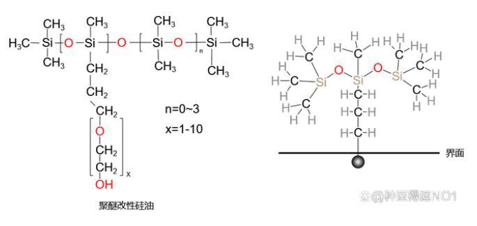 水性體系使用較多的有機硅潤濕劑一般為聚醚改性硅油,相對分子質量較小,n=0~3,x=1~10。同時大量的CH3鏈對外伸展,極大的降低表面張力,研究表明當親水基在鏈段中部位置時,效果最好。聚醚改性有機硅的分子結構式和機理如上圖所示。